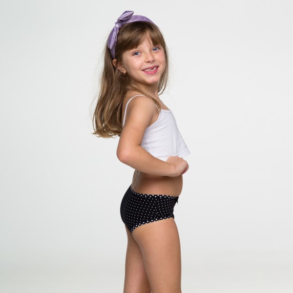 Calçinha Baby Estampada Poá na cor Preto em algodão egípcio com viés de elastano com poliamina. Lateral e costas maiores, modelagem super confortável.