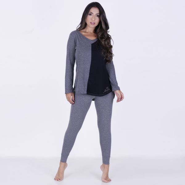 Pijama Longo Bicolor na cor cinza com preto confeccionado em algodão e poliéster. Composto por duas peças a blusa apresenta decote em "U", mangas longas , já a calça, em modelagem básica, tipo legging. Modelo ideal para boas noites de sono! Acompanha linda necessaire bicolor conforme a cor do pijama.