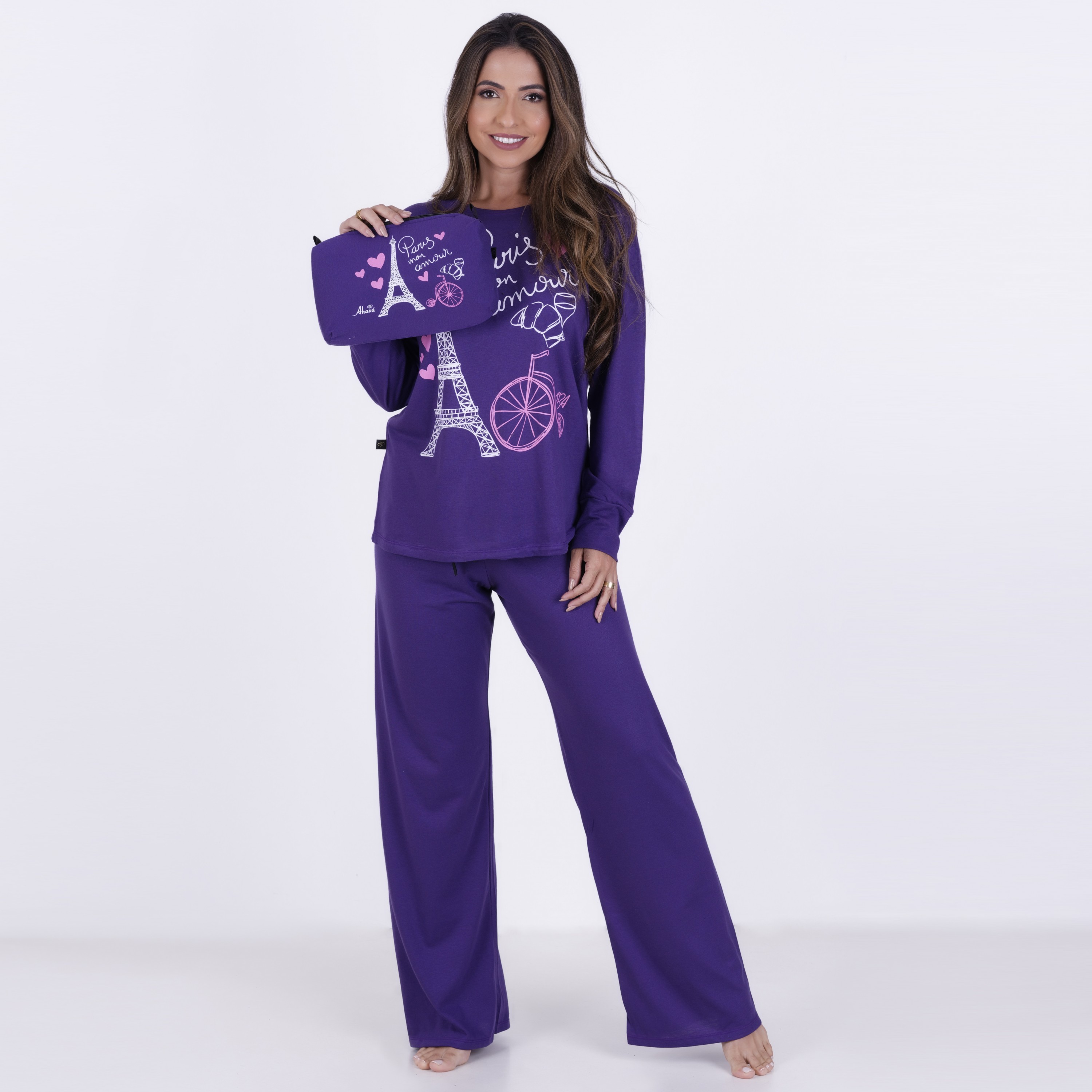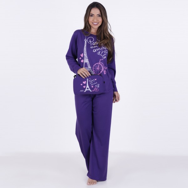 Pijama Longo em Algodão e Poliéster . Composto por duas peças, o modelo é ideal para boas noites de sono. A blusa apresenta decote em "U", mangas longas e detalhe de estampa em silk Paris na parte frontal. Já a calça, em modelagem básica, possui elástico e fita para amarrar. Acompanha linda necessaire com estampa em silk Paris.