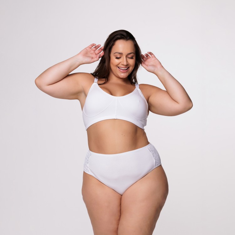 A camada interna possui tecido de compressão, que modela suavemente o corpo, enquanto as camadas externa e em contato com a pele garantem toque respirável e maciez. Com laterais em renda delicada.