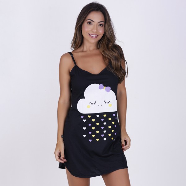 Camisola fabricada em Algodão com Poliéster na cor preta com estampa em silk nuvem. Em modelagem regata a peça possui alças finas ajustáveis com decote em "U". Confortável e divertida, a peça é a pedida perfeita para boas noites de sono. Acompanha linda necessaire na cor preta com estampa em silk nuvem.