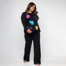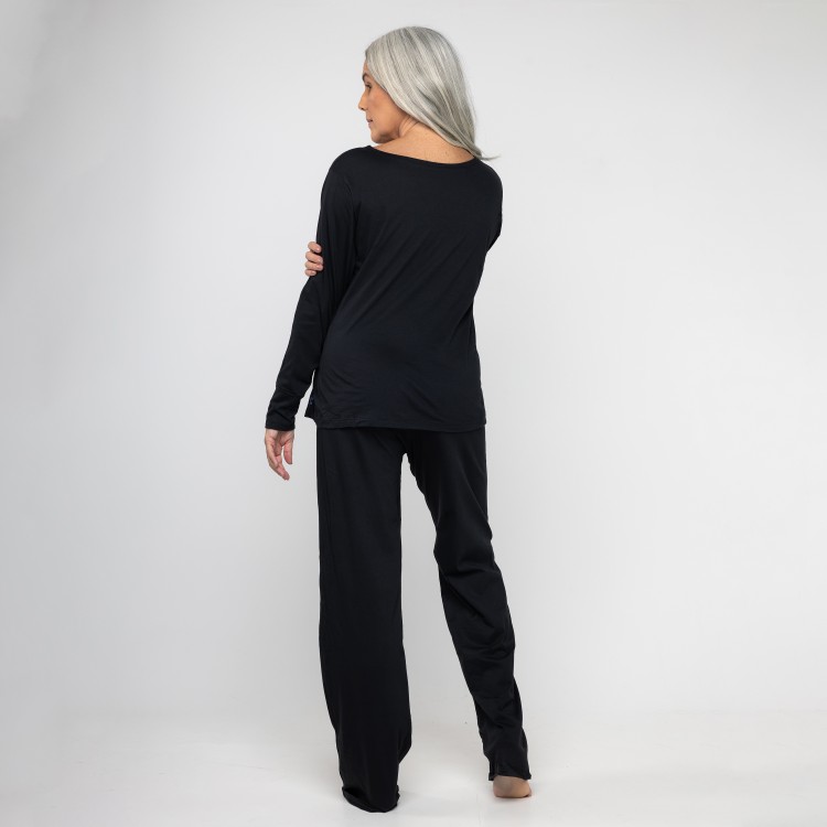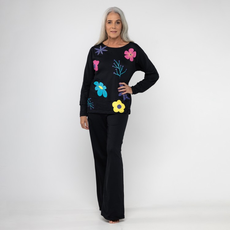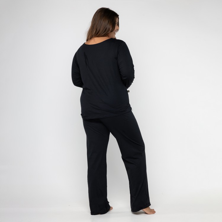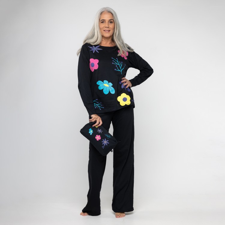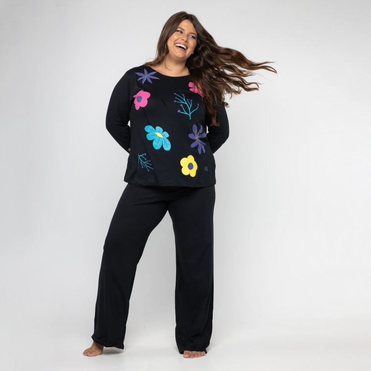 Pijama Longo em Algodão e Poliéster . Composto por duas peças, o modelo é ideal para boas noites de sono. A blusa apresenta decote em "U", mangas longas e detalhe de estampa em silk . Já a calça, em modelagem básica, possui elástico e fita para amarrar.