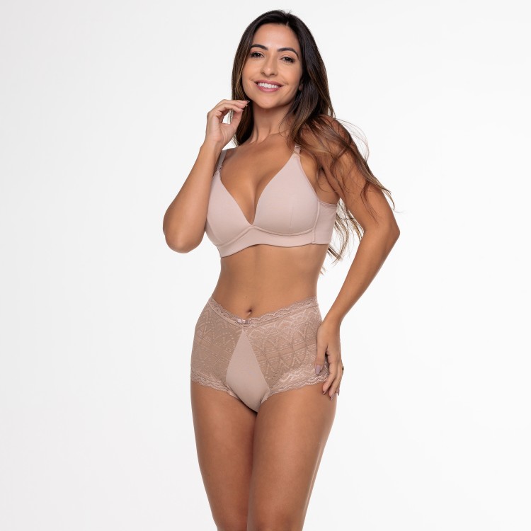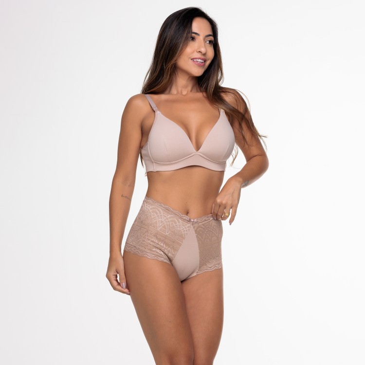 Calcinha caleçon toda em renda na cor areia