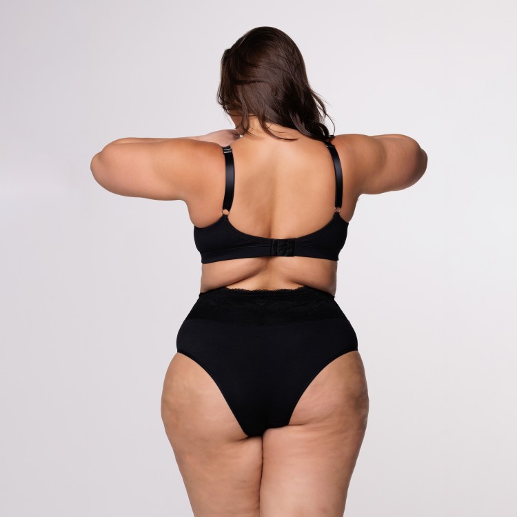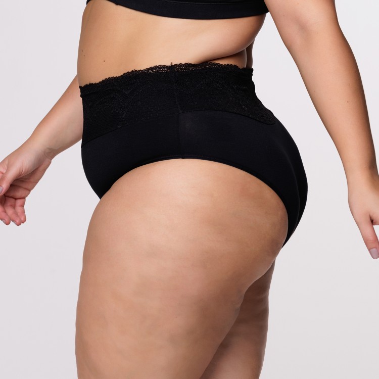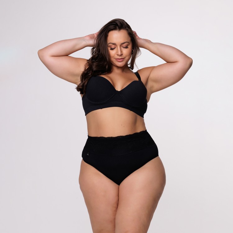 Calcinha de Cintura Alta Plus Size em Algodão Egípcio na cor Preta com Barra de Renda Forrada